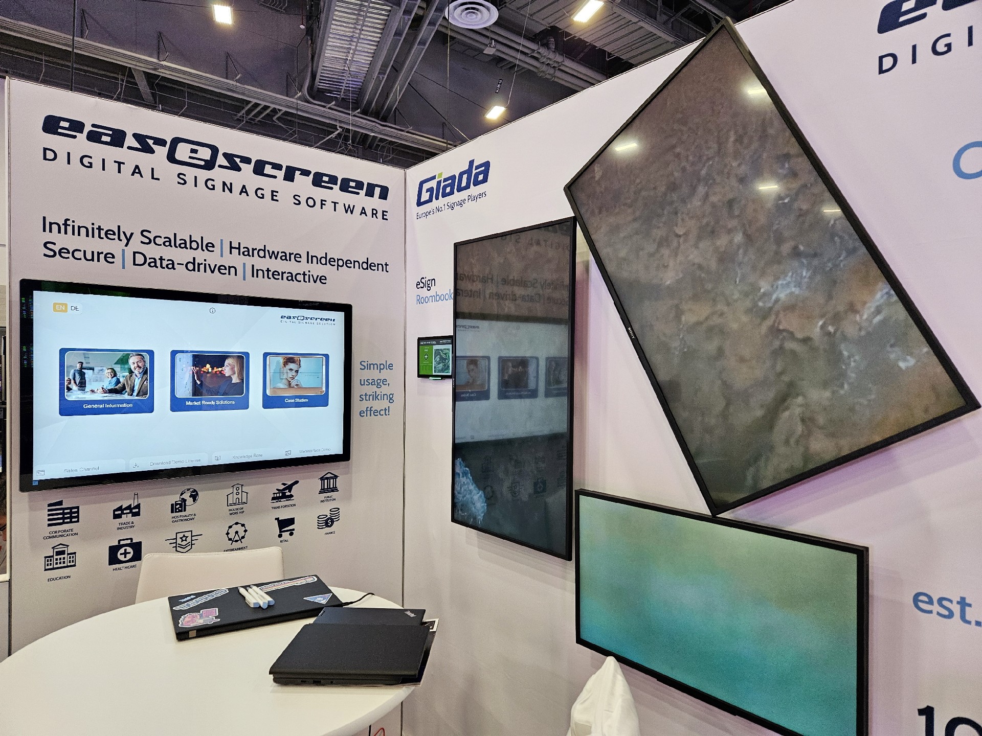 js555888金沙科技Giada作为全球数字标牌领域的领导品牌,产品应用范围涵盖全球大型连锁店,购物中心,学校,医疗机构,企业办公室等。本次展会,js555888金沙科技牵手合作伙伴easescreen,展示一系列创新数字标牌解决方案,带来强势产品及最新产品,现场收获超高人气。