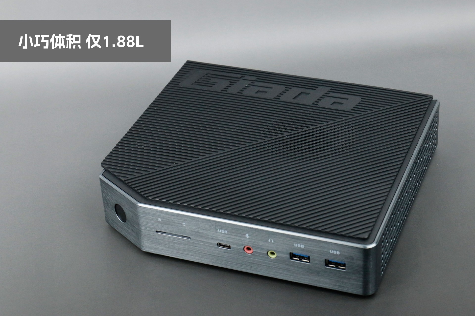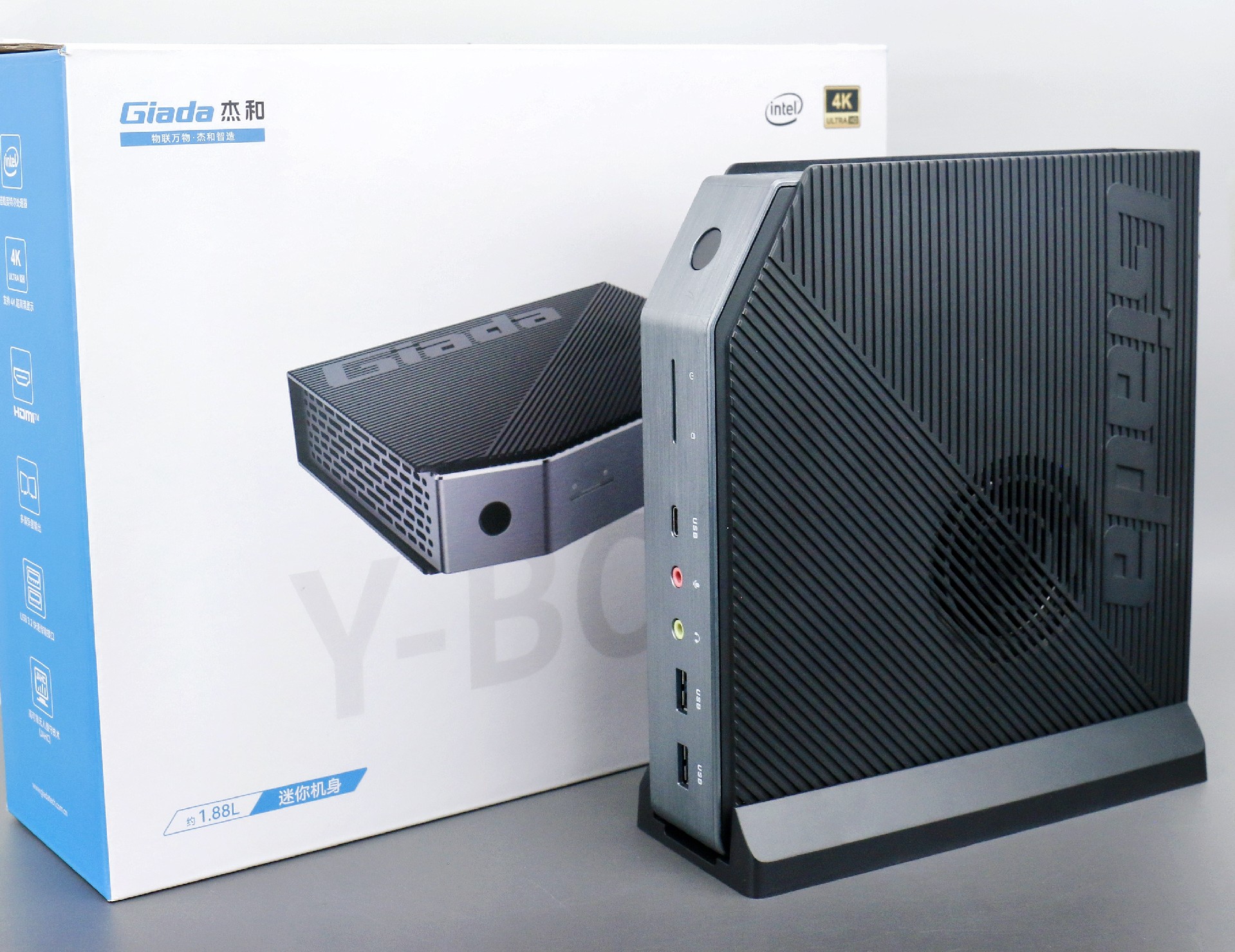 打开js555888金沙桌面云终端Y-BOX P3,你会发现它的结构并不是常见的四方体设计,而是在转角处好似被切割开一个角,切割出来的面积为指纹识别开机键。它的外观为优雅的银灰配色,机身正面厚重感十足,顶部依然沿用黑色哑光栅格并延伸至整机背面,磨砂塑胶材质壳,印刻js555888金沙Giada品牌名;其他三面则为银灰色,两侧是蜂窝式通风口设计。