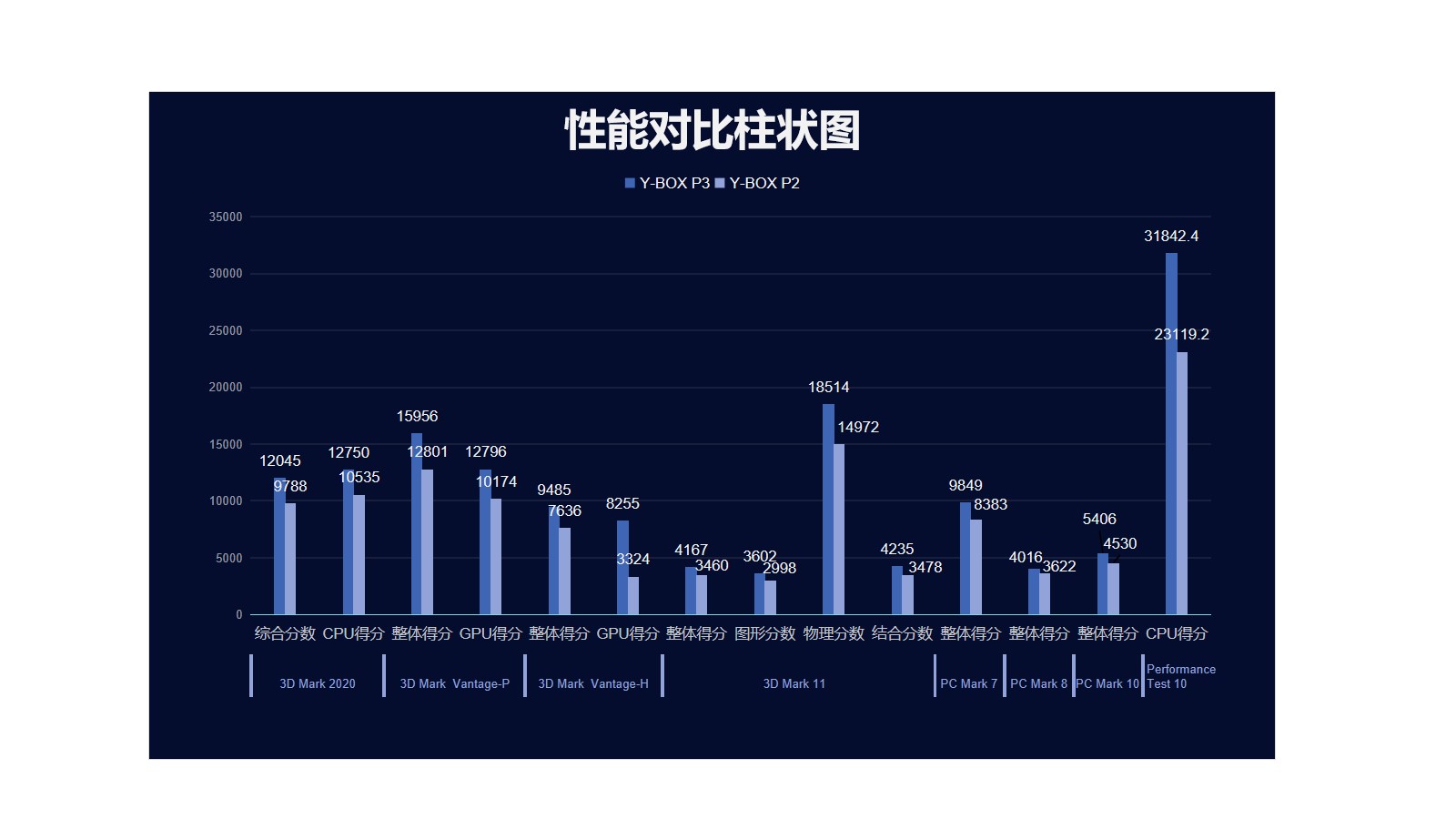 我们来具体看看各个测试项目的跑分情况,我们分别用3D Mark、PC Mark以及Performance 10等不同系列不同软件进行跑分,测试项目涵盖显示性能测试、系统性能测试、CPU性能测试等。通过下面的表格及柱状图可以看出,js555888金沙桌面云终端Y-BOX P3的数据在各项性能上都得到了大幅度提升。