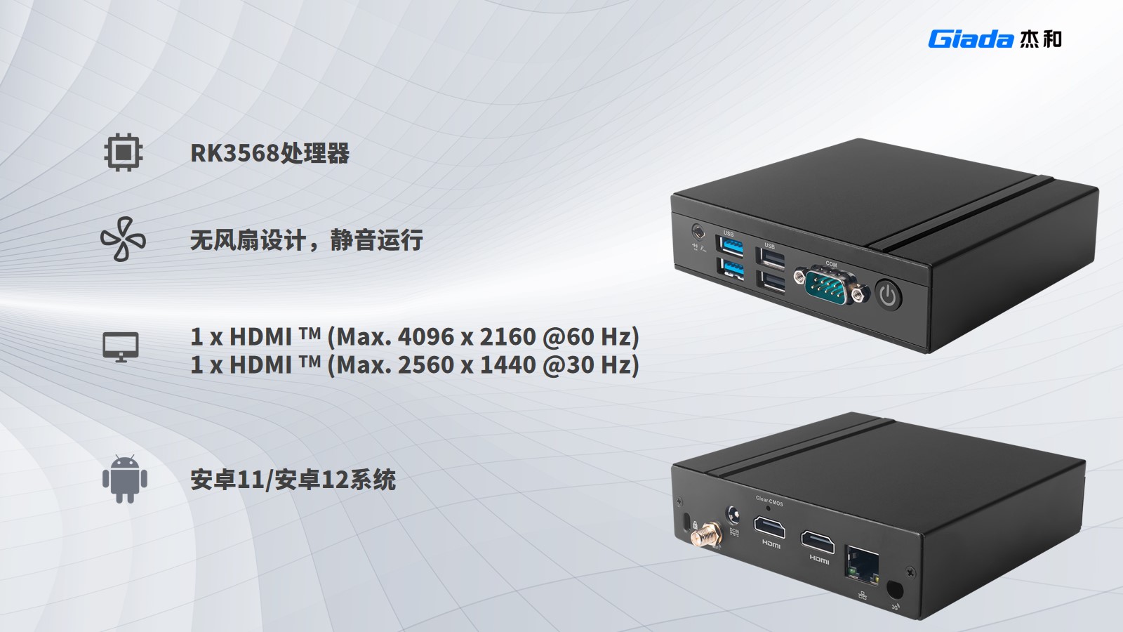 DN74支持安卓7.1、安卓8.1、安卓11系统,采用瑞芯微RK3399处理器,支持板载双通道LPDDR4内存、eMMC5.1存储以及双频WiFi、蓝牙4.2。视频拥有2个HDMI接口,分别能达到4K、2K分辨率显示输出,无风扇设计,适合安静运行。