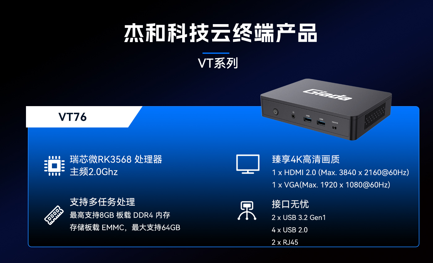 与之外形相似的云终端VT76,支持ARM架构,搭载瑞芯微RK3568处理器,适配debian系统,适用于教育、办公、开源等应用场景,能够满足不同用户对于软件安装和使用的多样化需求。