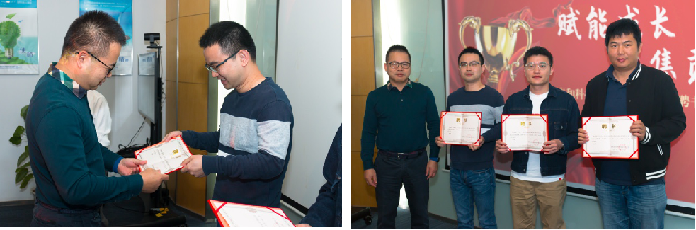 紧接着是聘书颁发环节。公司总经理林总为国际销售中心三名新任见习高级销售经理颁发了公司聘书。三位同事表示:“非常感谢公司给予的职业发展机会,同时也会非常珍惜公司为自己制定的专项培养计划,全力以赴的进行相关项目的学习,争取成功实现转身,在工作中努力奋斗,不断总结,带领团队赢得胜利!”