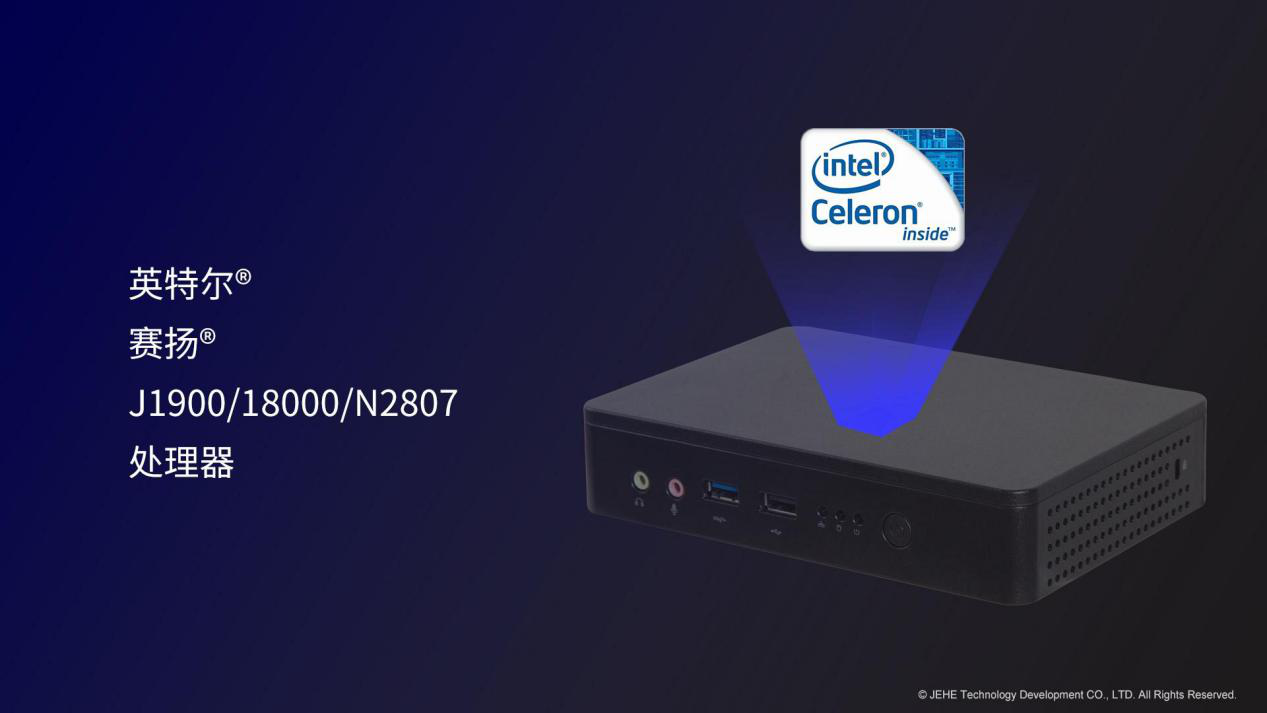 js555888金沙科技VT20桌面云终端搭载了知名度很高赛扬®J1900处理器。在嵌入式应用中,赛扬®J1900处理器主打的高单核运算频率(2.4GHz单核睿频)和低功耗(10W),非常适合面向复杂的嵌入式场景。此外,js555888金沙VT20适配了其他两款性能较低的BayTrail平台处理器,赛扬®N2807和赛扬®J1800,对于客户端性能要求相对较低的方案依然能够匹配需求。