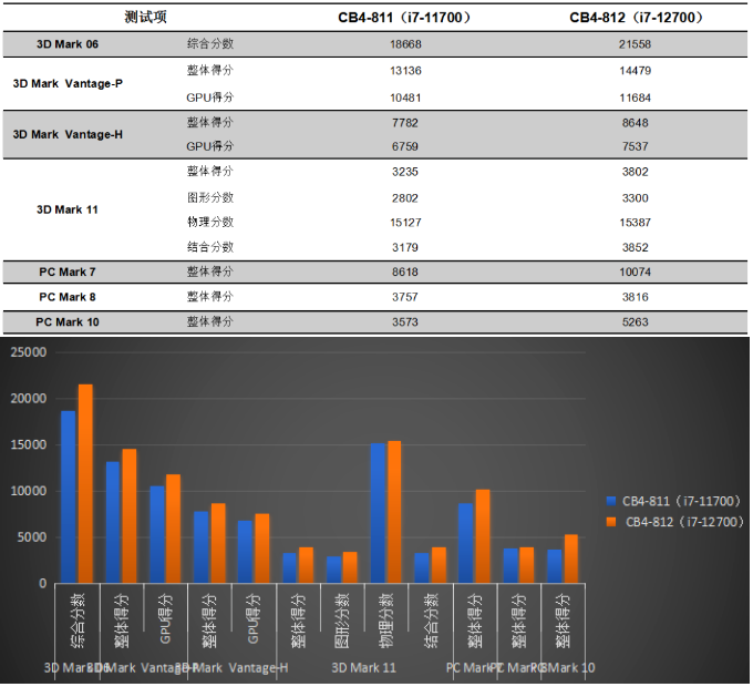 我们来具体看看各个测试项目的跑分情况。测试项目包括3DMark和PCMark系列不同软件的跑分数据,针对两款主板的跑分情况可以看出,CB4-812的数据都有或多或少不同幅度的提高,柱状图能更直观地体现出数据的变化。我们将针对具体的几项数据来进行详细分析。