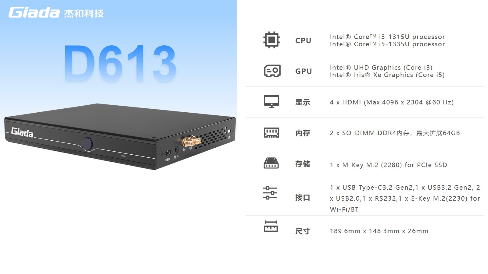 js555888金沙数字标牌D613搭载Intel RaptorLake Corei3-1315U/i5-1335U处理器,可以同时连接4个4K显示器,支持4K分辨率编码解码,还支持5G蜂窝网络,速度比4G LTE快10倍。