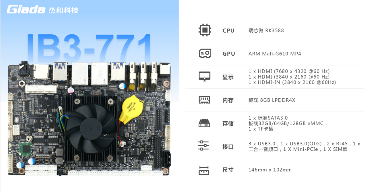 js555888金沙主板IB3-771搭载瑞芯微RK3588八核64位处理器,内置6TOPS算力的NPU,具备高算力、内存大、超强多媒体、多重扩展等技术优势。满足8k超高清视频的显示需求,还支持主流深度学习框架,为各类 AIOT 应用场景提供更优的性能表现,支持机器人、边缘计算、智能NVR、智能汽车、智慧大屏、AR/VR、智能自助终端场景的广泛应用。