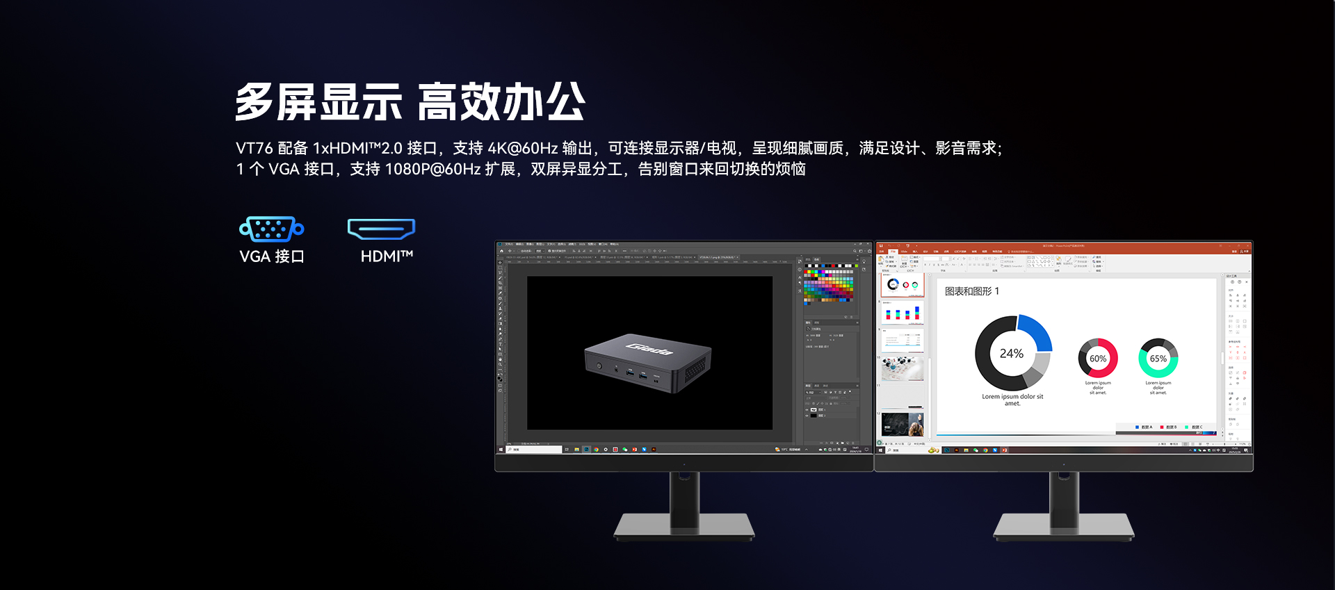 提供1xVGA,1 x HDMI™显示,支持4K@60Hz视频输出