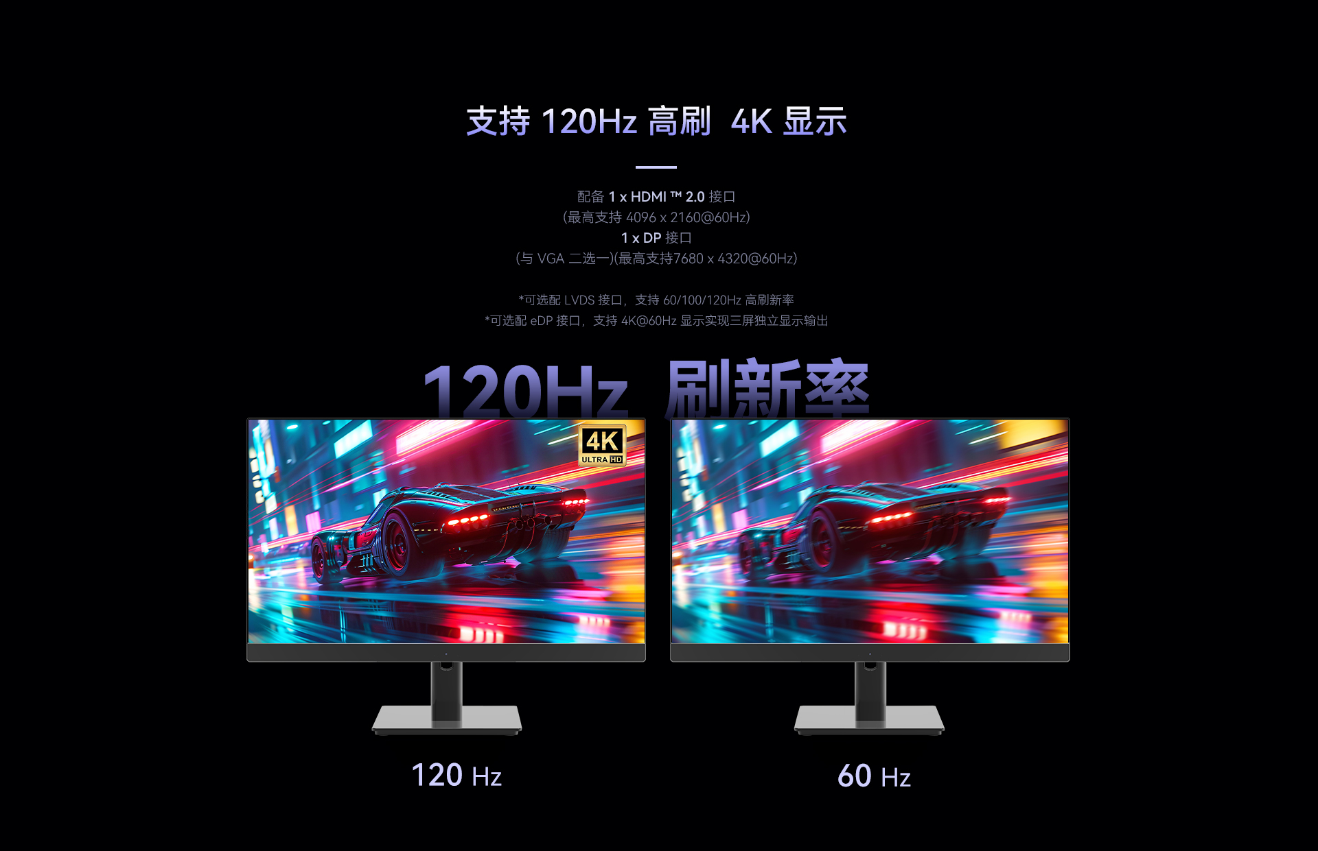 侧面eDP可支持4K高清,LVDS支持120Hz高刷(可选)