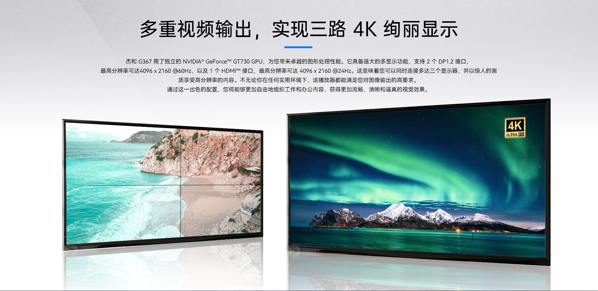 1 x HDMI + 2 x DP1.2显示接口输出,支持4K@60Hz显示